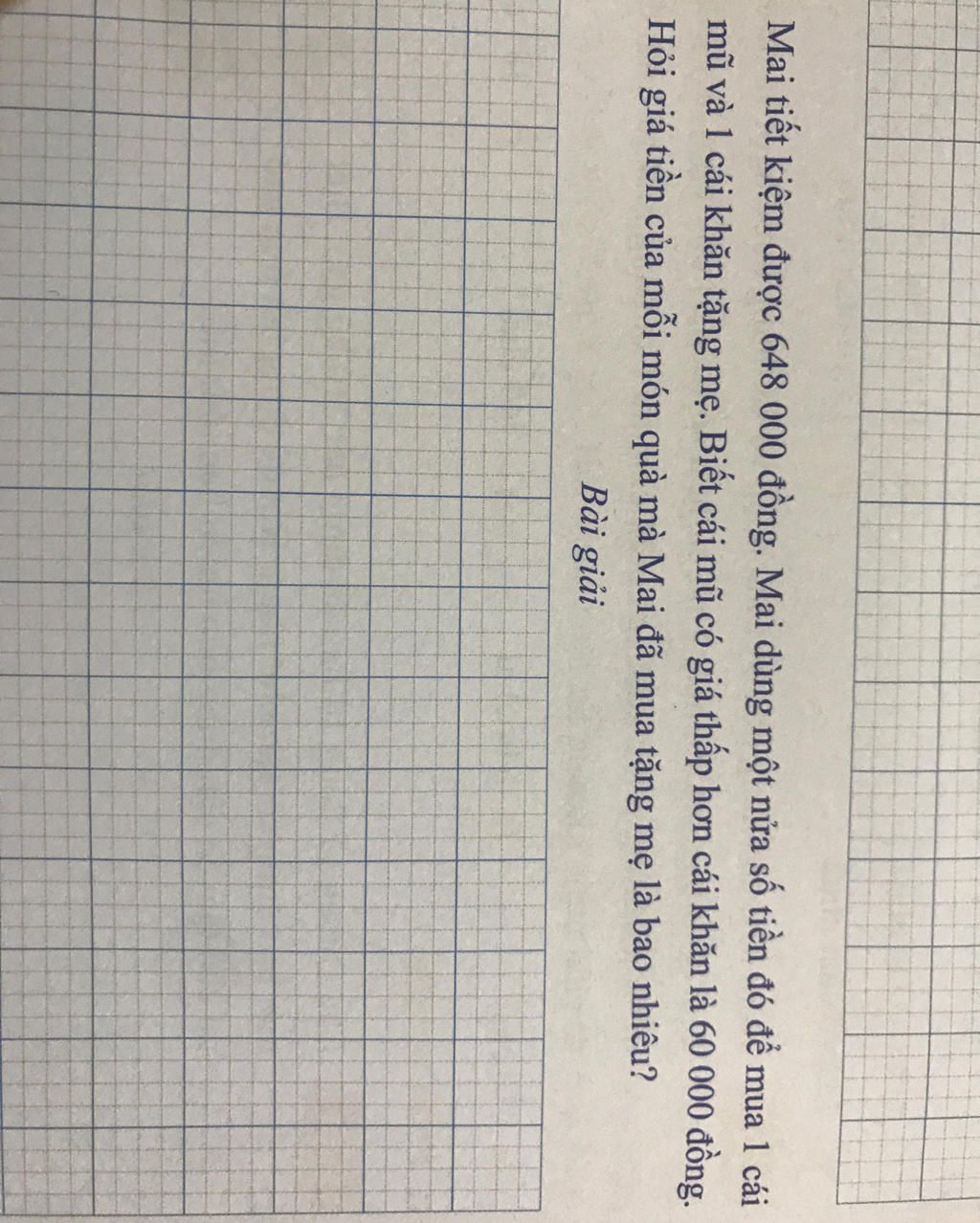 Mai tiết kiệm được 648000 đồng mai dùng một nửa số tiền đó để mua một cái mũ và 1 cái khăn tặng mẹ.Biết cái mũ có giá thấp hơn cái khăn là 60000 đồng .Hỏi giá tiền của mỗi món quà mà mai đã mua tặng mẹ là bao nhiêu?