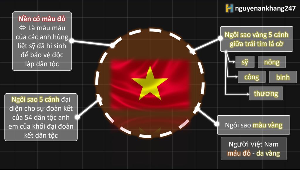 Quốc kì Việt Nam có hình chữ nhật, nền đỏ, ở giữa là ngôi sao vàng năm cánh. Màu đỏ tượng trưng cho cách mạng, màu vàng tượng trưng cho dân tộc Việt Nam (da vàng). Năm cánh tượng trưng cho năm tầng lớp: sĩ, nông dân, công nhân, thương nhân và binh cùng đoàn kết trong đại gia đình các dân tộc Việt Nam.