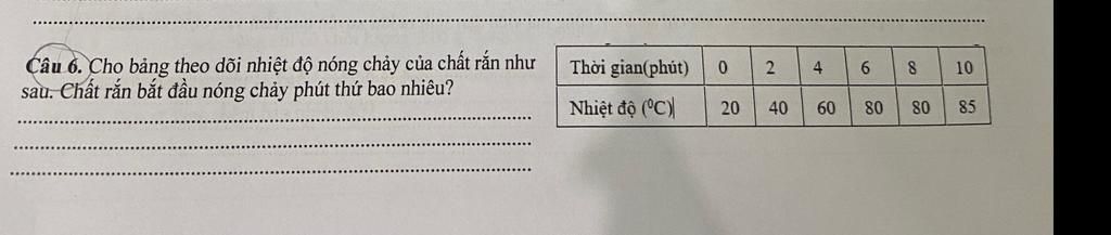 Từ phút thứ `6` đến phút thứ `8` thì nhiệt độ của vật không đổi dù cho cung cấp nhiệt, do đó vật đang nóng chảy trong thời gian này. Chất rắn bắt đầu nóng chảy vào phút thứ `6`