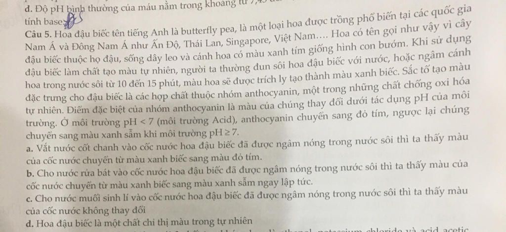 d) đúng vì trong môi trường `pH` khác nhau sẽ cho màu sắc khác nhau