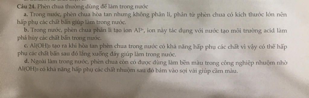 `b)` Sai vì `Al^{3+}` tạo môi trường acid nhưng không có tác dụng phá hủy chất bẩn