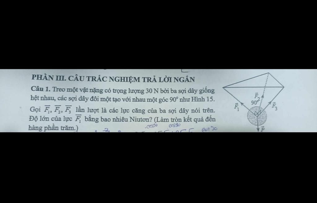 Câu 1. Treo một vật nặng có trọng lượng 30 N bởi ba sợi dây giống