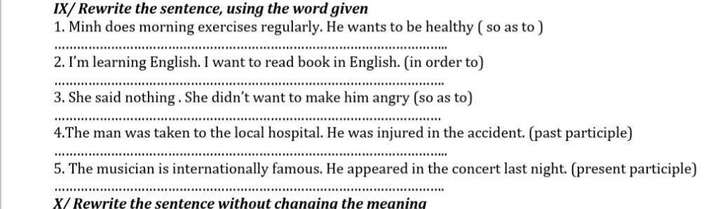 1. Minh does morning exercises regularly so as to be healthy 2. I'm learning English in order to read book in English 3. She said nothing so as not to make him angry 4. The man injured in the accident was taken to the local hospital 5. The musician appearing in the concert last night is internationally famous Rút gọn1. Minh does morning exercises regularly so as to be healthy 2. I'm learning English in order to read book in English 3. She said nothing so as not to make him angry 4. The man injured in the accident was taken to the local hospital 5. The musician... xem thêm