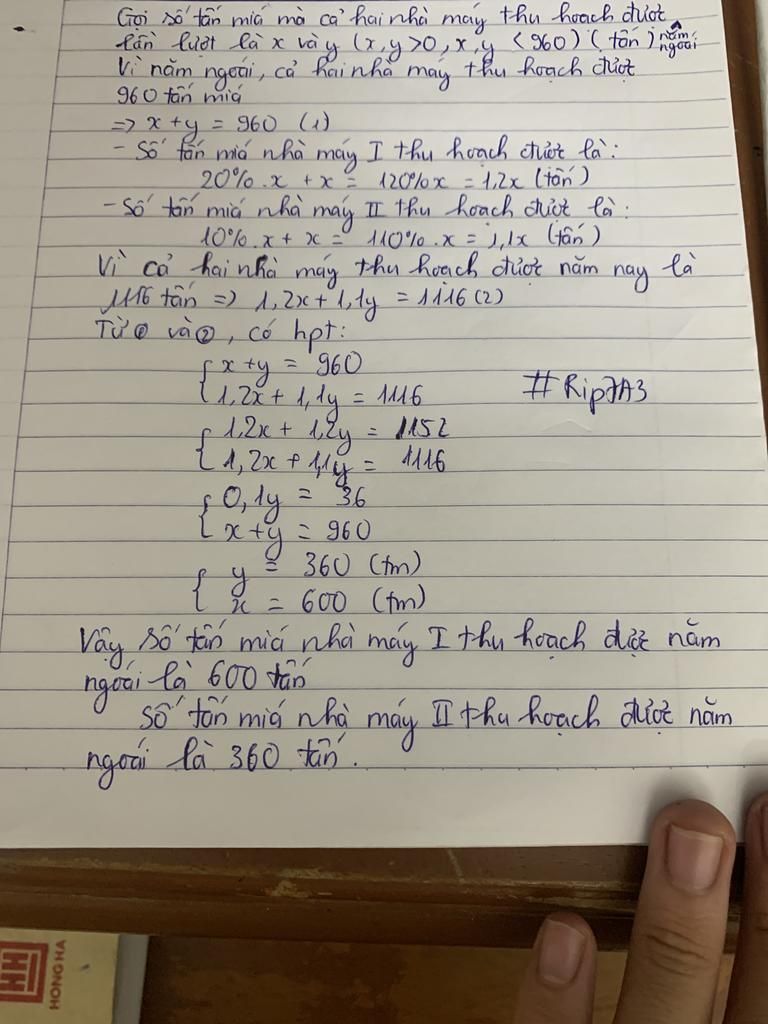 Năm ngoái, hai nhà máy đường thu hoạch được 960 tấn mía. Năm nay, nhà máy số 1 thu hoạch vượt mức 20%, nhà máy số 2 thu hoạch vượt mức 10% so với năm ngoái. Do đó cả hai nhà máy đã thu hoạch được 1116 tấn mía. Hỏi năm ngoái nhà máy số 1 thu hoạch được bao nhiêu tấn mía