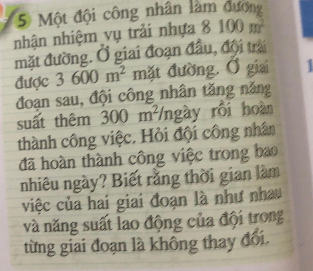 Gọi năng suất đội làm trong giai đoạn $1$ là $x\quad m^2/$ ngày, $(x>0)$