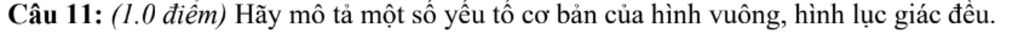 Giải thích các bước giải:xác định đâu là hình vuông , đâu là hình tam giác . hình vuông sẽ có 4 cạnh bằng nhau , hình lục giác đều có 6 cạch bằng nhau