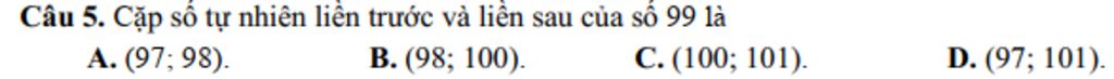 `->` Cặp số tự nhiên liền trước và liền sau của số `99` là `(98;100)`