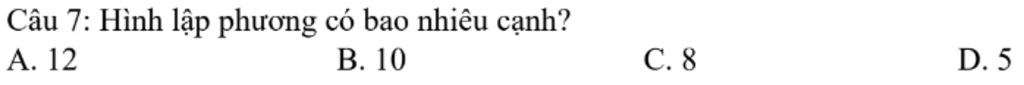 K/niệm `:` Hình lập phương có tổng `12` cạnh `(8` cạnh đáy và `4` cạnh bên `)`