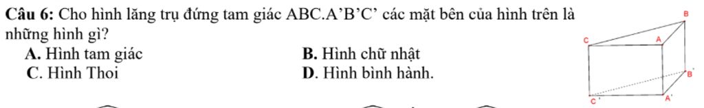 `->` Mặt bên của lăng trụ đứng tam giác `ABC.A'B'C'` là hình chữ nhật