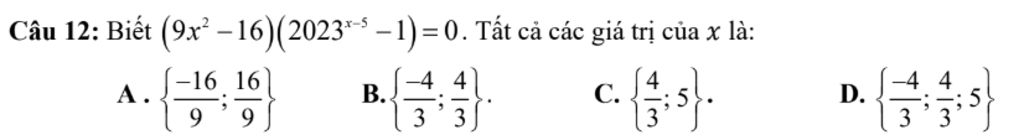 `->9x^2-16=0` hoặc `2023^(x-5)-1=0`