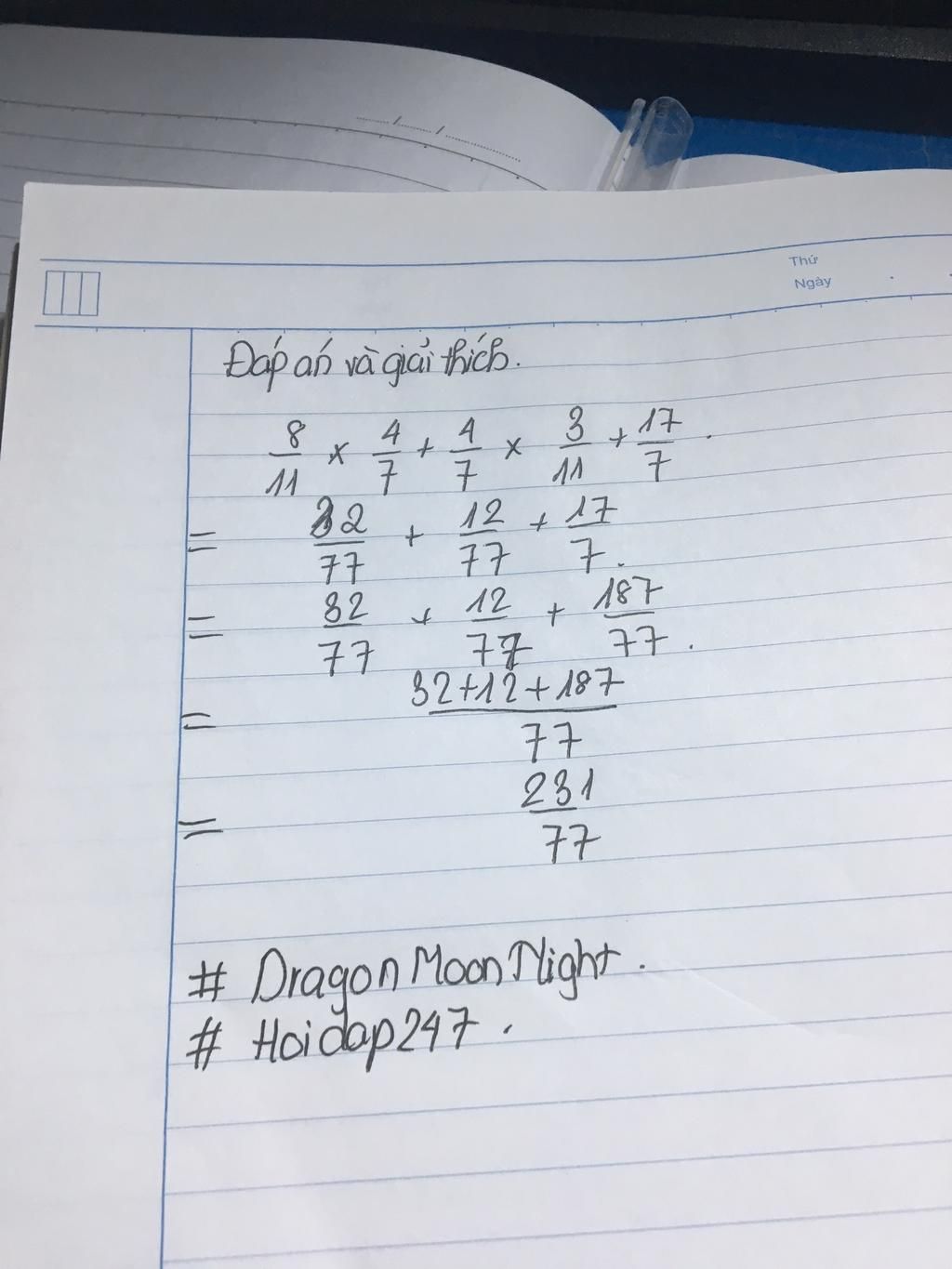 ` = 4/7 × ( 8/11 + 3/11 ) + 17/7 `