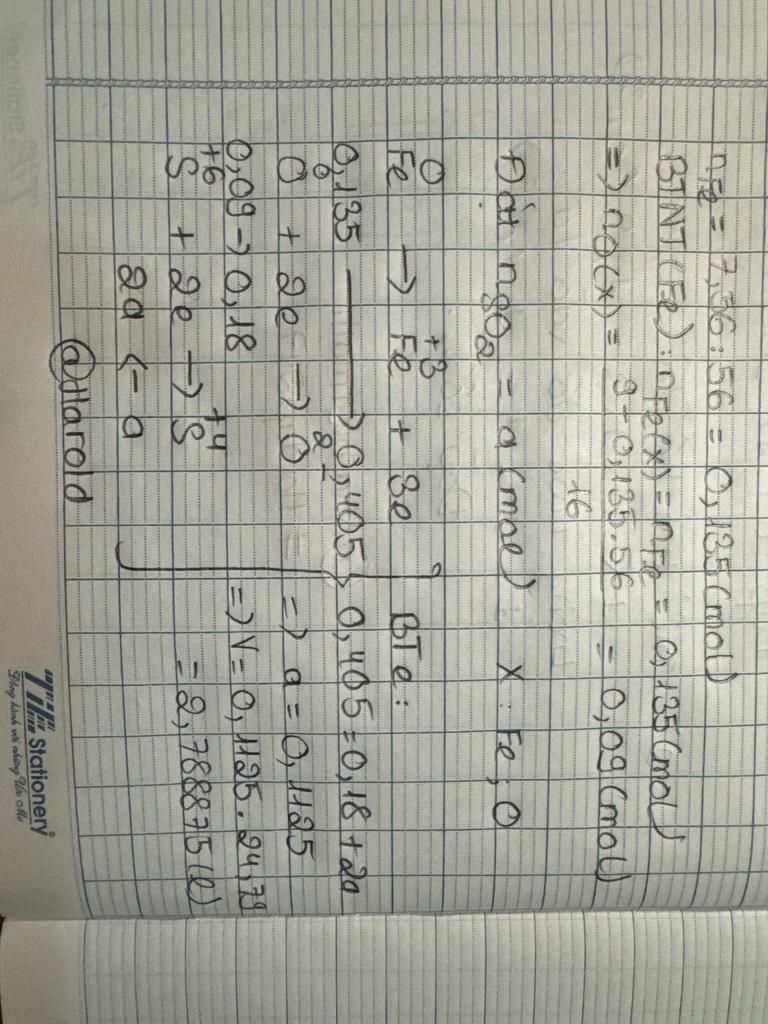 `n_{\text{Fe}} = \frac{\text{Khối lượng Fe}}{M_{\text{Fe}}} = \frac{7,56 \text{ g}}{56 \text{ g/mol}} = 0,135 \text{ mol}`