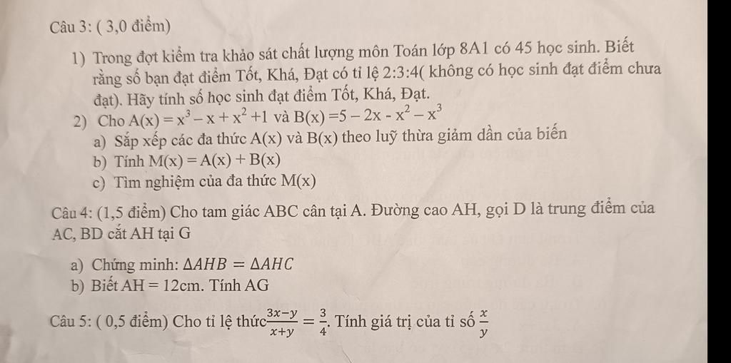 1) Trong đợt kiểm tra khảo sát chất lượng môn Toán lớp 8A1 có 45 học sinh. Biết