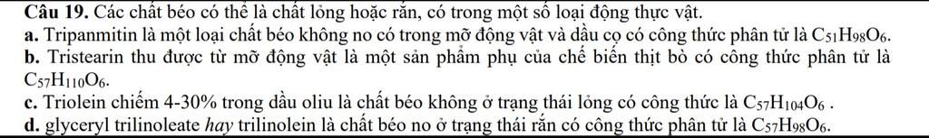 d, Sai. Trilinolein $(C_{17}H_{31}COO)_3C_3H_5$ là chất béo không no.