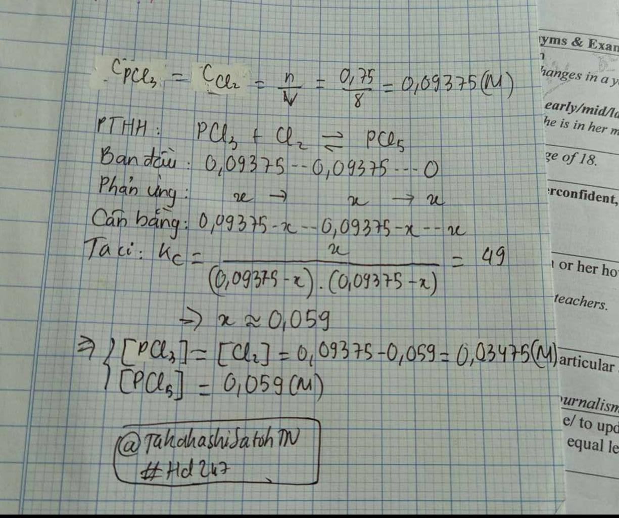 Cho 0,75 mol PCl3 và 0,75 mol Cl2 vào bình kín dung tích 8 lít ở 227oC. Tính nồng độ các chất ở trạng thái cân bằng, biết giá trị hằng số cân bằng Kc ở 227oC là 49.
