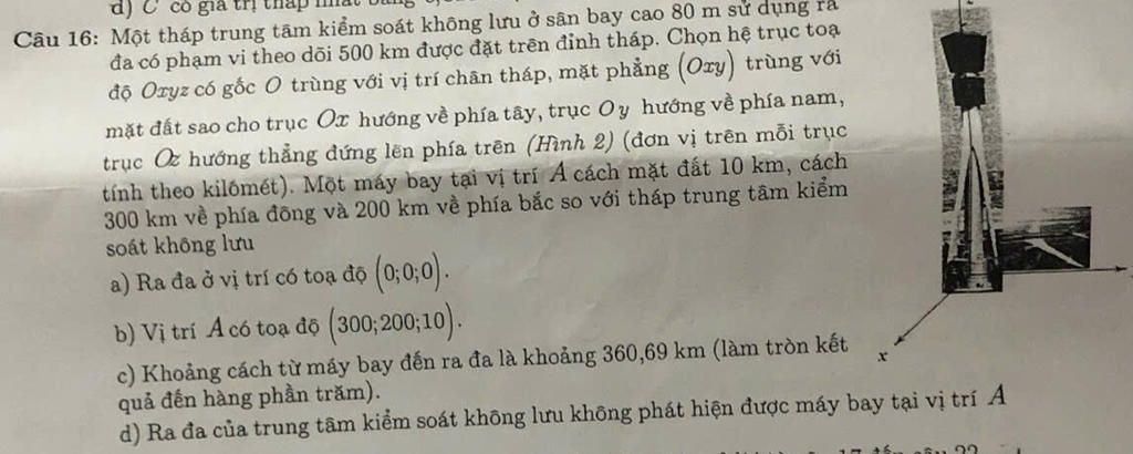 Vì máy bay tại vị trí $A$ cách mặt đất $10$ km , cách $300$ km về phía đông và $200$ km về phía bắc so với pháp trung tâm kiểm soát không lưu $\to A$ có tọa độ $(-300, -200, 10)$