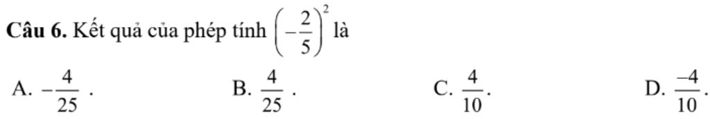 `(-2/5)^2 = (-2)^2/(5^2) = (2.2)/(5.5) = 4/25`