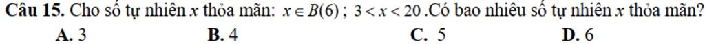 Câu 15. Cho số tự nhiên x thỏa mãn: x ∈ B(6); 3<x<20 .Có bao nhiêu số tự nhiên x thỏa mãn?