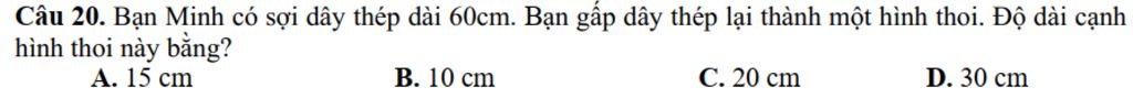 Câu 20. Bạn Minh có sợi dây thép dài 60cm. Bạn gấp dây thép lại thành một hình thoi. Độ dài cạnh hình thoi này bằng?