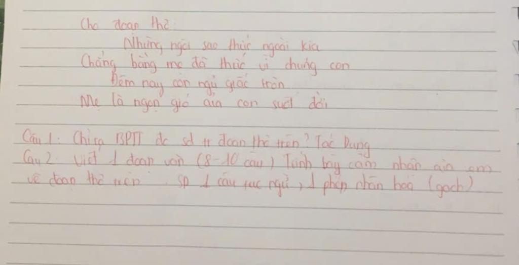 Đoạn thơ được trích trong bài thơ "Mẹ" của nhà thơ Trần Quốc Minh đã để lại trong em ấn tượng sâu sắc. Bài thơ có thể thơ lục bát đã thể hiện được chất trữ tình chan chứa. Biện pháp tu từ so sánh "Chẳng bằng mẹ đã thức vì chúng con, Mẹ là ngọn gió của con suốt đời" đã tăng sức gợi hình, gợi cảm xúc, tăng tính chân thực và sinh động cho hình ảnh và công lao của mẹ. Hình ảnh góp phần nhiều nhất làm nên cái hay của đoạn thơ là hình ảnh của mẹ được so sánh với những ngôi sao và ngọn gió. Vì hình ảnh so sánh làm tăng sức gợi hình, gợi cảm xúc và nhấn mạnh được tình yêu thương, sự hy sinh lớn lao của mẹ dành cho các con của mình. Giống như muôn loài, chúng luôn yêu thương, chăm sóc cho những đứa con của mình thì mẹ của chúng ta cũng vậy. Nhờ có mẹ, các con mới có thể có được cuộc sống ấm no, êm ấm và hạnh phúc. Vì vậy, mỗi đứa con đều cần học theo câu tục ngữ "Tu đâu cho bằng tu nhà, Thờ cha kính mẹ mới chân tu" để luôn hiếu thảo và yêu thương cha mẹ của mình. Tóm lại, đoạn thơ đã để lại trong em ấn tượng sâu sắc về công lao, hy sinh của mẹ dành cho con và sự biết ơn, kính trọng của con dành cho mẹ.