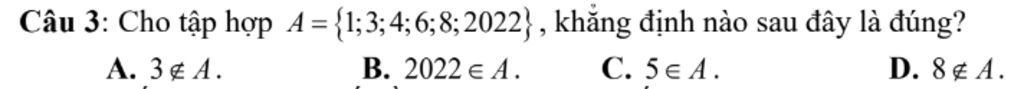 Câu 3: Cho tập hợp A={1;3;4;6;8;2022} , khẳng định nào sau đây là đúng?