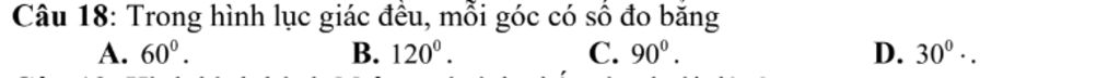 Câu 18: Trong hình lục giác đều, mỗi góc có số đo bằng