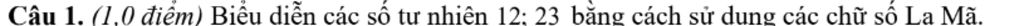 Câu 1. (1,0 điểm) Biểu diễn các số tự nhiên 12; 23 bằng cách sử dụng các chữ số La Mã.