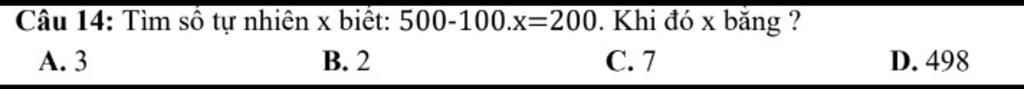 Câu 14: Tìm số tự nhiên x biết: 500-100.x=200. Khi đó x =