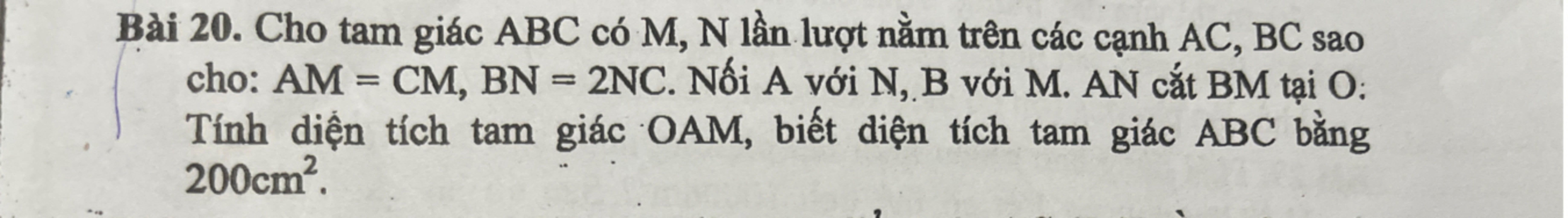 cho: AM = CM, BN = 2NC. Nối A với N, B với M. AN cắt BM tại O