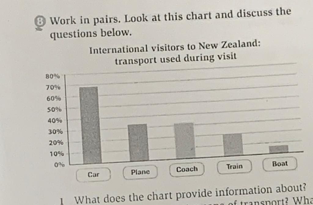 Biểu đồ cung cấp thông tin về một số phương tiện giao thông (ô tô, máy bay, xe buýt đường dài, tàu hỏa, thuyền) được sử dụng bao nhiêu bởi du khách quốc tế trong suốt chuyến thăm của họ đến New Zealand. Nó chỉ ra rằng ô tô là phương tiện phổ biến nhất, chiếm 70 phần trăm. Trong khi đó, thuyền không phải là phương tiện yêu thích của họ, chỉ được sử dụng bởi dưới 10 phần trăm du khách.