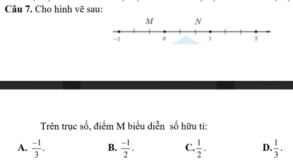 Điểm `M` biểu diễn số hữu tỉ: `0 - 1/3 = (-1)/3`
