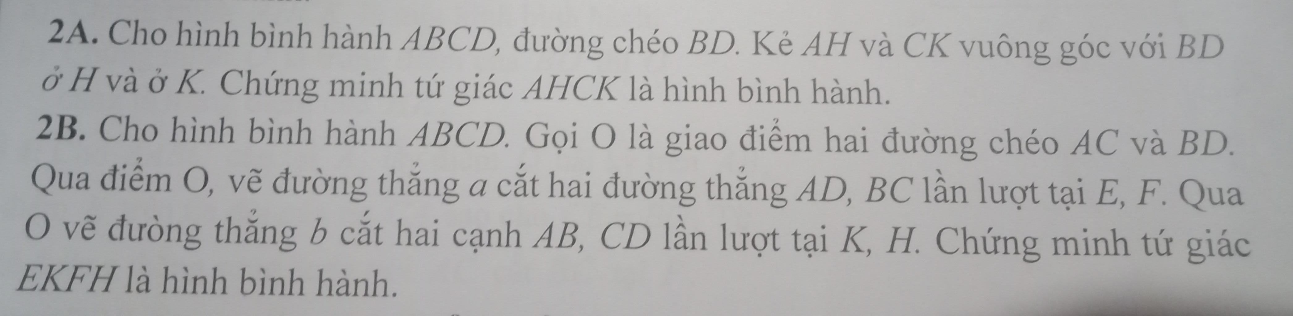 2A. Cho hình bình hành ABCD, đường chéo BD. Kẻ AH và CK vuông góc với BD