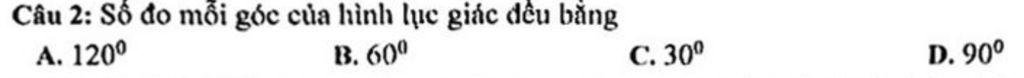 Câu 2: Số đo mỗi góc của hình lục giác đều bằng