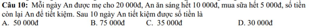 Câu 10: Mỗi ngày An được mẹ cho 20 000đ, An ăn sáng hết 10 000đ, mua sữa hết 5 000đ, số tiền còn lại An để tiết kiệm. Sau 10 ngày An tiết kiệm được số tiền là