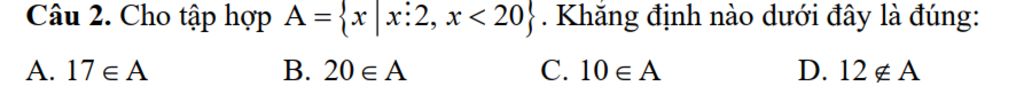 Câu 2. Cho tập hợp A={x|x $\vdots$ 2,x<20}. Khẳng định nào dưới đây là đúng: