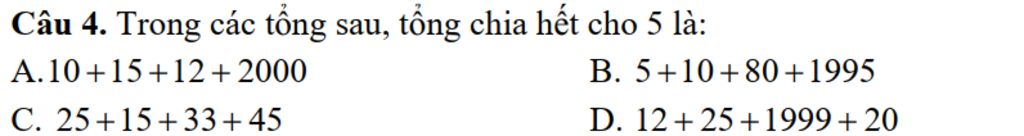 Câu 4. Trong các tổng sau, tổng chia hết cho 5 là: