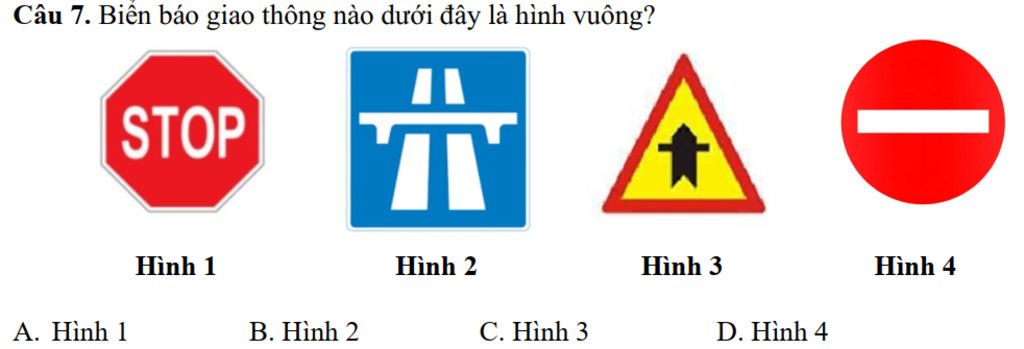 Câu 7. Biển báo giao thông nào dưới đây là hình vuông?