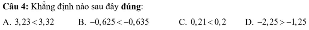 `A. 3,23 < 3,32` đúng vì `23 < 32 => 3,23 < 3,32`