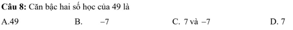 Còn đề là căn bậc hai số học của `49` nên đáp án chỉ là `7` vì `7^2=49`
