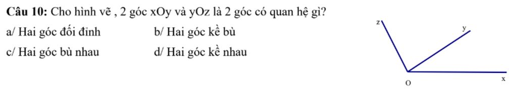 Ta thấy tia `Oy` nằm trong tia `Ox` và tia `Oz` nên `hat(xOy)` và `hat(yOz)` là `2` góc kề nhau