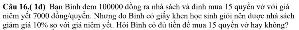 Vậy Bình có đủ tiền để mua `15` quyển vở