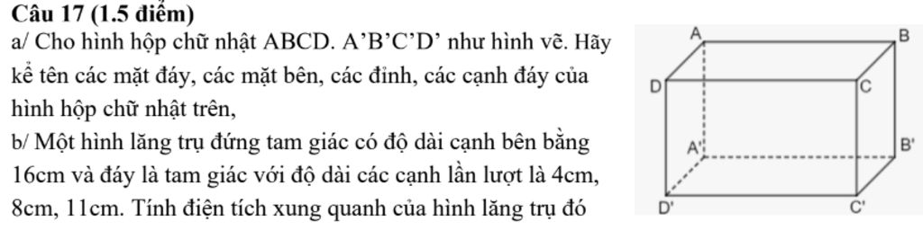 Các đỉnh của hình hộp chữ nhật là: `A` ; `B` ; `C` ; `D` ; `A'` ; `B'` ; `C'` ; `D'`