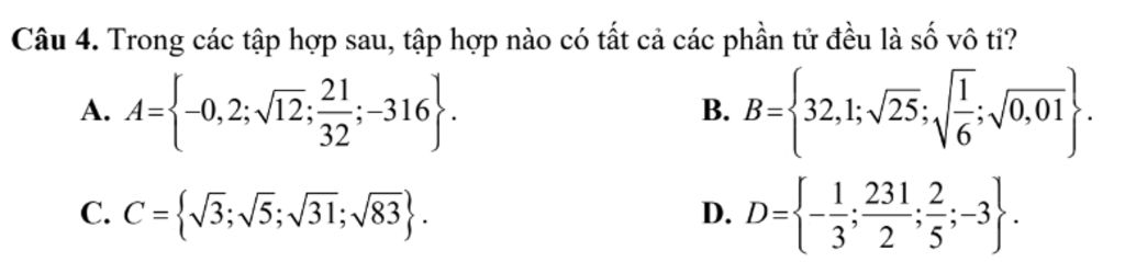 `bb D:`Sai vì `(-1)/3;231/2;2/5;-3` là số hữu tỉ
