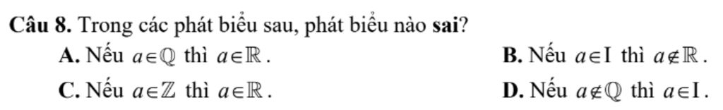 `bb B:`Sai vì nếu `a in I` thì `a in RR`