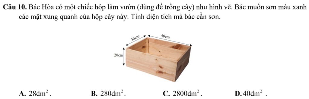 Câu 10. Bác Hòa có một chiếc hộp làm vườn (dùng để trồng cây) như hình vẽ. Bác muốn sơn màu xanh