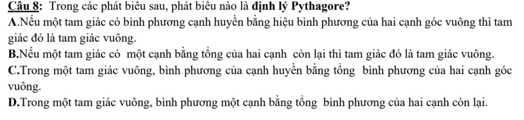 Câu 8: Trong các phát biểu sau, phát biểu nào là định lý Pythagore?