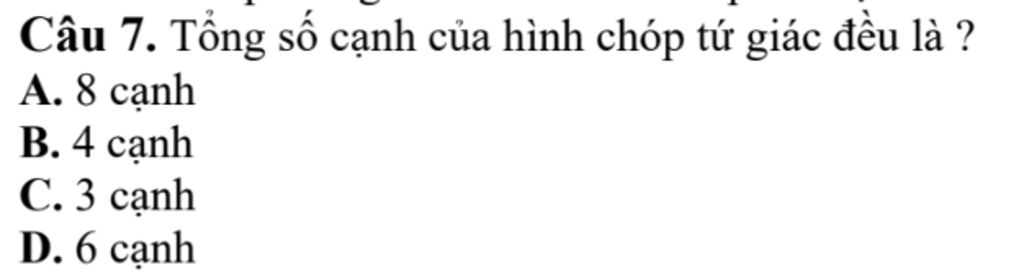 `***` Hình chóp tứ giác đều có tổng là `8` cạnh `(4` cạnh bên và `4` cạnh đáy `)`