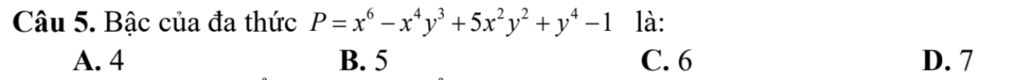 Câu 5. Bậc của đa thức P= `x^6 −x^4y^3+5x^2y^2+y^4−1` là: