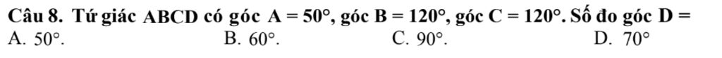 Câu 8. Tứ giác ABCD có góc A=50°, góc B = 120°, góc C = 120°. Số đo góc D =