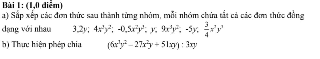 a) Sắp xếp các đơn thức sau thành từng nhóm, mỗi nhóm chứa tất cả các đơn thức đồng `3,2y; 4x³y²; -0,5x²y³; y; 9x³y²; -5y; 3/4x²y³` dạng với nhau